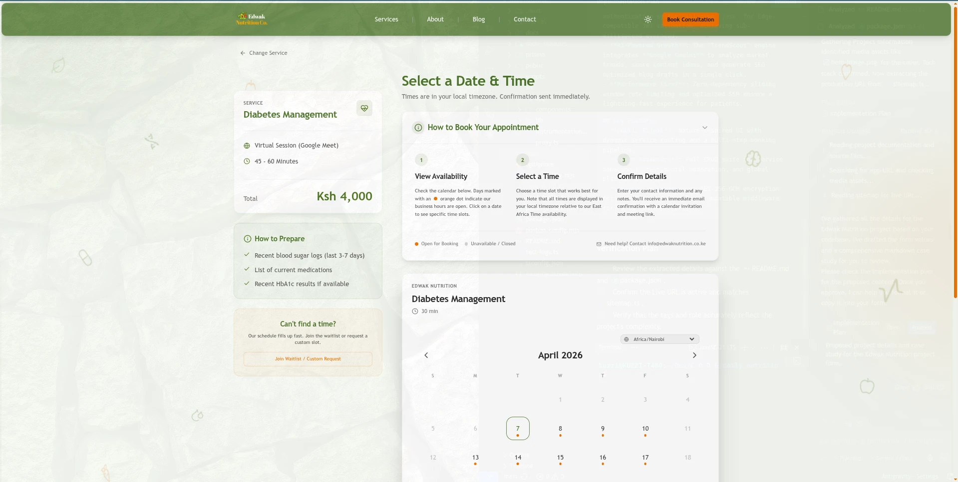 A nature-inspired UI featuring dynamic service routing, customized nutritional plans, and a frictionless multi-step booking pipeline.