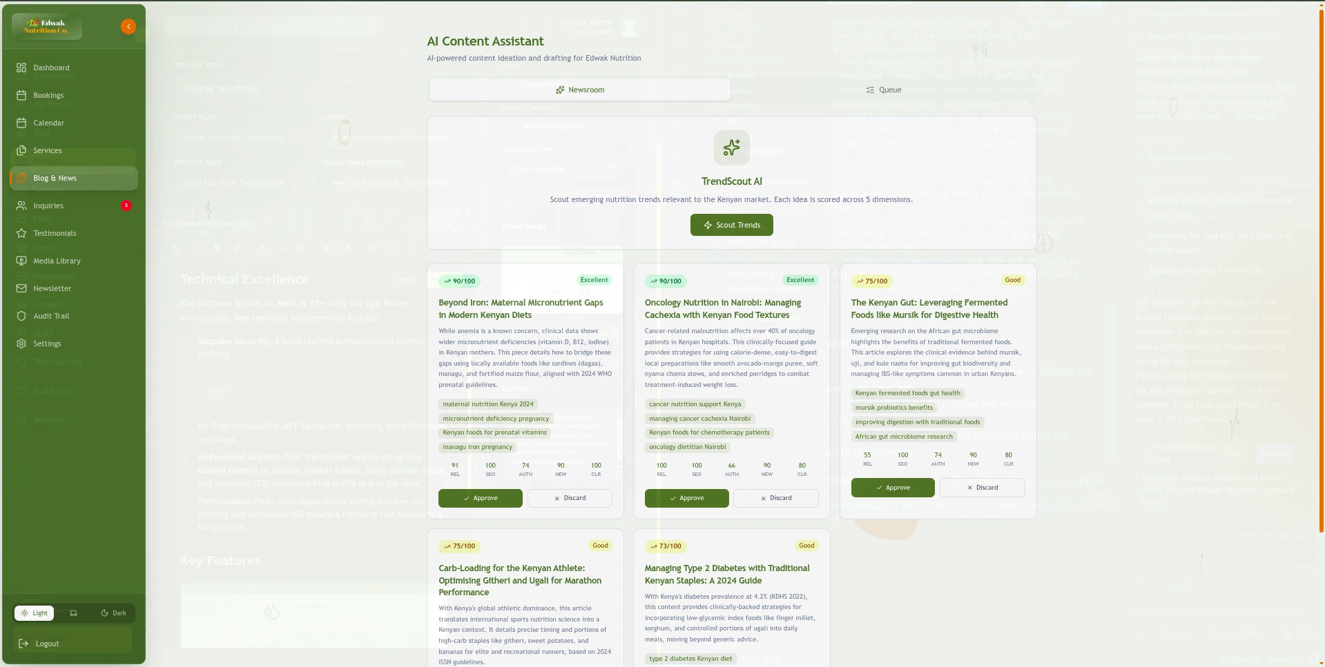 - AI-Powered Growth: The "TrendScout" engine integrates Google Gemini to analyze market trends, score content ideas, and generate SEO-optimized blog drafts in a single click.